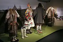 After the Russian Revolution, the Nenets culture suffered due to the Soviet collectivization policy. The government of the Soviet Union tried to force the nomadic Samoyeds to settle down permanently. They were forced to settle in villages and their children were educated in state boarding schools, which resulted in erosion of their cultural identity.[4] One significant way in which the Nenets culture was affected was in the change of the male's societal role. Previously, in the tundra, the male had the very important task of herding the reindeer. However, once the Nenets had to transition to a life away from the tundra, men found that they had lost their role. Much of the responsibility that awaited them in the village was considered, from the traditional point of view, to be women's work.[4] This erasure in the male identity was further enhanced by the Soviet government. In taiga villages occupations such as market gardening, fur farming, cattle breeding, trade, medicine, etc. were emphasized and these happened to be the ones that were marketed towards women.[4] Lastly, the jobs offered by the Soviet government were often occupied by women and not men as many of the men had taken up the habit of hard drinking.[4] Consequently, the once traditional culture of the Nenets people was swiftly upended. Many, especially in the Nenets Autonomous Okrug, lost their mother tongue and became assimilated.