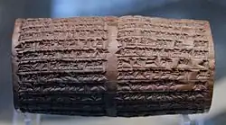 Cylinder by Nabonidus, commemorating restoration work done on a temple dedicated to the god Sîn in Ur. Exhibited at the British Museum.