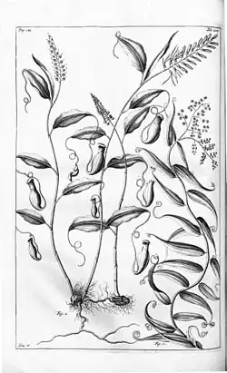 One of the earliest illustrations of Nepenthes appears in Leonard Plukenet's Almagestum Botanicum of 1696.[54] The plant, called Utricaria vegetabilis zeylanensium, is undoubtedly N. distillatoria.[15]