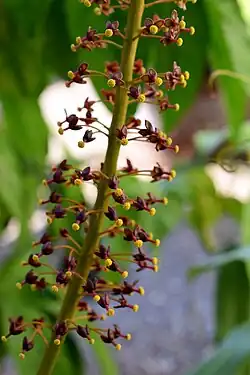 Prey usually consists of insects, but the largest species (e.g. N. rajah and N. rafflesiana) may occasionally catch small vertebrates, such as "frogs, birds, and small mammals".[9][10] Records of cultivated plants trapping small birds have been made.[11][12] Flowers occur in racemes or more rarely in panicles with male and female flowers on separate plants. Three species have symbiotic relationships with treeshrews, which eat the nectar produced by the plant and defecate into the pitchers, providing valuable nutrients.[13]
