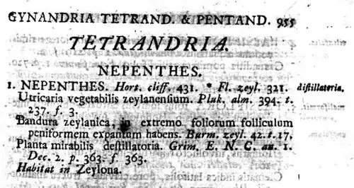 22. ^ Linnaeus, C. 1737. Nepenthes. Hortus Cliffortianus. Amsterdam.