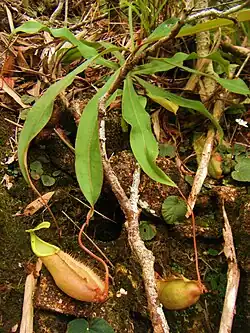 N. lowii has also formed a dependent relationship, but with vertebrates instead of insects. The pitchers of N. lowii provide a sugary exudate reward on the reflexed pitcher lid (operculum) and a perch for tree shrew species, which have been found eating the exudate and defecating into the pitcher. A 2009 study, which coined the term "tree shrew lavatories", determined between 57 and 100% of the plant's foliar nitrogen uptake comes from the faeces of tree shrews.[36] Another study showed the shape and size of the pitcher orifice of N. lowii exactly match the dimensions of a typical tree shrew (Tupaia montana).[37][38] A similar adaptation was found in N. macrophylla, N. rajah, N. ampullaria, and is also likely to be present in N. ephippiata.[38][39]