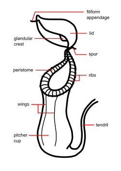 The lower part of the trap contains glands that absorb nutrients from captured prey. Along the upper inside part of the trap is a slick, waxy coating, which makes the escape of its prey nearly impossible. Surrounding the entrance to the trap is a structure called the peristome (the "lip"), which is slippery and often quite colourful, attracting prey, but offering an unsure footing. The prey-capture effectiveness of the peristome is further enhanced in moist environments, where condensation may cause a thin water film to form on the surface of the peristome. When wet, the slippery surface of the peristome causes insects to "aquaplane", or slip and fall, into the pitcher.[8] Above the peristome is a lid (the operculum); in many species, this keeps rain from diluting the fluid within the pitcher, the underside of which may contain nectar glands that attract prey.[5]