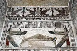 Temple decoration at Dendera, depicting the goddesses Isis and Nephthys watching over the corpse of their brother Osiris
