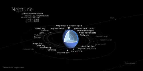 In contrast to the strongly seasonal atmosphere of Uranus, which can be featureless for long periods of time, Neptune's atmosphere has active and consistently visible weather patterns. At the time of the Voyager 2 flyby in 1989, the planet's southern hemisphere had a Great Dark Spot comparable to the Great Red Spot on Jupiter. In 2018, a newer main dark spot and smaller dark spot were identified and studied.[28] These weather patterns are driven by the strongest sustained winds of any planet in the Solar System, as high as 2,100 km/h (580 m/s; 1,300 mph).[29] Because of its great distance from the Sun, Neptune's outer atmosphere is one of the coldest places in the Solar System, with temperatures at its cloud tops approaching 55 K (−218 °C; −361 °F). Temperatures at the planet's centre are approximately 5,400 K (5,100 °C; 9,300 °F).[30][31] Neptune has a faint and fragmented ring system (labelled "arcs"), discovered in 1984 and confirmed by Voyager 2.[32]