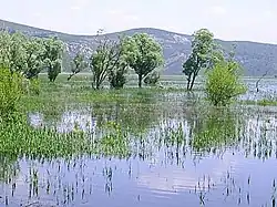 Gornje Blato-Deransko Lake is supplied by the karstic water sources of the Trebišnjica River, emerging from bordering hills. It is hydro-geologically connected to the Neretva River through its effluent, the Krupa River, formed out of five lakes (Škrka, Deranja, Jelim, Orah, Drijen). Large portions are permanently flooded and isolated by wide groves of reedbebds and trees. It represents a more interesting preserved area.[18]