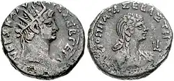 Coin of Nero and Poppaea Sabina Billon tetradrachm of Alexandria, Egypt, 25 mm, 12.51 gr. Obverse: radiate head right; ΝΕΡΩ. ΚΛΑΥ. ΚΑΙΣ. ΣΕΒ. ΓΕΡ. ΑΥ. Reverse: draped bust of Poppaea right; ΠΟΠΠΑΙΑ ΣΕΒΑΣΤΗ. Year LI = 10 = 63–64.