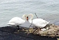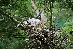 Bird nests vary from simple depressions in the ground known as scrapes to largely unstructured collections of branches to elaborately woven pendants or spheres. The megapodes, one of the few groups who do not directly brood their young, incubate their young in a mound of decomposing vegetation. One species, Macrocephalon maleo, uses volcanic sand warmed by geothermal heat to keep its eggs warm.[1] Among the simple nest builders are falcons, owls, and many shorebirds. The weavers exhibit perhaps the most elaborate nests, complete with strands of grass tied into knots. Most bird nests lie somewhere in the middle, with the majority building cup-shaped nests using some combination of mud, twigs and leaves, and feathers. Some birds, such flamingos and swifts, use saliva to help hold their nest together. The edible-nest swiftlet uses saliva alone to construct their nests.[5] The rufous hornero nest is composed entirely of mud and feces, which is placed on tree branches to allow the sun to harden it into a usable structure.[6] The tailorbirds stitch together leaves to provide cover for their nest sites.[1]