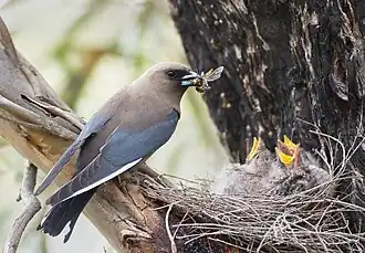 Many nest builders provide parental care to their young, while others simply lay their eggs and leave. Brooding (incubating eggs by sitting on them) is common among birds. In general, nest complexity increases in relation to the level of parental care provided.[1] Nest building reinforces social behavior, allowing for larger populations in small spaces to the point of increasing the carrying capacity of an environment. Insects that exhibit the most complex nidification also exhibit the greatest social structure. Among mammals, the naked mole-rat displays a caste structure similar to the social insects while building extensive burrows that house hundreds of individuals.[2]
