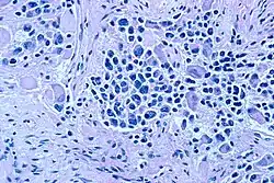 On microscopy, the tumor cells are typically described as small, round and blue, and rosette patterns (Homer Wright pseudorosettes) may be seen. Homer Wright pseudorosettes are tumor cells around the neuropil, not to be confused with a true rosettes, which are tumor cells around an empty lumen.[29] They are also distinct from the pseudorosettes of an ependymoma which consist of tumor cells with glial fibrillary acidic protein (GFAP)–positive processes tapering off toward a blood vessel (thus a combination of the two).[30] A variety of immunohistochemical stains are used by pathologists to distinguish neuroblastomas from histological mimics, such as rhabdomyosarcoma, Ewing's sarcoma, lymphoma and Wilms' tumor.[31]