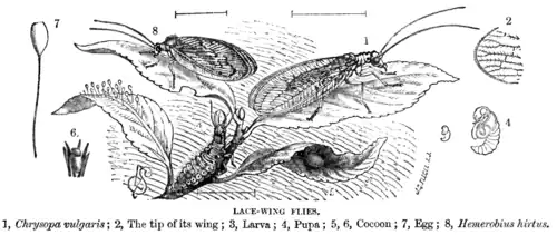 The larvae of most families are predators. Many chrysopids, hemerobiids and coniopterygids eat aphids and other pest insects, and some have been used for biological control (either from commercial distributors, but also abundant and widespread in nature).[7][8]