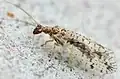 The larvae are specialised predators, with elongated mandibles adapted for piercing and sucking. The larval body form varies between different families, depending on the nature of their prey. In general, however, they have three pairs of thoracic legs, each ending in two claws. The abdomen often has adhesive discs on the last two segments.[5] There is no connection between the midtgut and the hindgut in the larvae, and their Malpighian tubules are instead used for producing silk for their cocoon, which exits through their anus. In the families Myrmeleontidae and Ascalaphidae the tenth abdominal segment is modified into a spinneret that is usually retracted into the ninth amdominal segment, and used for the construction of the cocoon.[6]