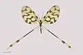 They have four wings, usually similar in size and shape, and a generalised pattern of veins.[4] Some neuropterans have specialised sense organs in their wings, or have bristles or other structures to link their wings together during flight.[5]