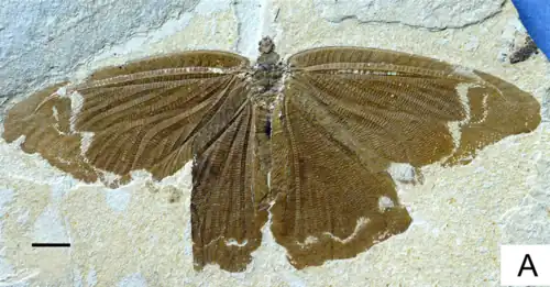 Neuropterans first appeared during the Permian period, and continued to diversify through the Mesozoic era.[2] During this time, several unusually large forms evolved, especially in the extinct family Kalligrammatidae, often called "the butterflies of the Jurassic" for their large, patterned wings.[3]