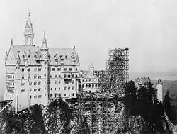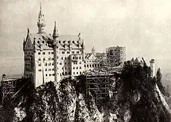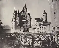 In 1868, the ruins of the medieval twin castles were completely demolished; the remains of the old keep were blown up.[25] The foundation stone for the palace was laid on 5 September 1869; in 1872, its cellar was completed, and in 1876, everything up to the first floor, the gatehouse being finished first. At the end of 1882, it was completed and fully furnished, allowing Ludwig to take provisional lodgings there and observe the ongoing construction work.[24] In 1874, management of the civil works passed from Eduard Riedel to Georg von Dollmann.[26] The topping out ceremony for the Palas was in 1880, and in 1884 the King moved in to the new building. In the same year, the direction of the project passed to Julius Hofmann, after Dollmann had fallen from the King's favour. The palace was erected as a conventional brick construction and later encased in various types of rock. The white limestone used for the fronts came from a nearby quarry.[27]