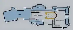 Had it been completed, the palace would have had more than 200 interior rooms, including premises for guests and servants, as well as for service and logistics. Ultimately, no more than about 15 rooms and halls were finished.[50] In its lower stories the Palas accommodates administrative and servants' rooms and the rooms of today's palace administration. The King's staterooms are situated in the upper stories. The anterior structure accommodates the lodgings in the third floor, above them the Hall of the Singers. The upper floors of the west-facing posterior structure are filled almost completely by the Throne Hall. The total floor space of all floors amounts to nearly 6,000 square metres (65,000 sq ft).[50]