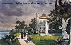 Even after his debts had reached 14 million marks, King Ludwig II insisted on continuation of his architectural projects; he threatened suicide if his creditors seized his palaces.[37] In early 1886, Ludwig asked his cabinet for a credit of 6 million marks, which was denied. In April, he followed Bismarck's advice to apply for the money to his parliament. In June, the Bavarian government decided to depose the King who was living at Neuschwanstein at the time. On 9 June, he was incapacitated and on 10 June, he had the deposition commission arrested in the gatehouse.[39] In expectation of the commission, he alerted the gendarmerie and fire brigades of surrounding places for his protection.[36] A second commission headed by Bernhard von Gudden arrived on the next day, and the King was forced to leave the palace that night. Ludwig was put under the supervision of Gudden. On 13 June, both died under mysterious circumstances in the shallow shore water of Lake Starnberg near Berg Castle.