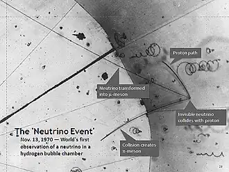 ![]() The first use of a hydrogen bubble chamber to detect neutrinos, on 13 November 1970, at Argonne National Laboratory. Here a neutrino hits a proton in a hydrogen atom; the collision occurs at the point where three tracks emanate on the right of the photograph. | |