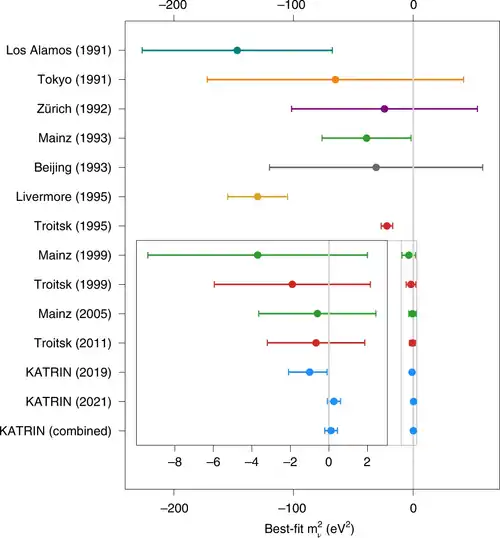 - ^ Aker, M.; Batzler, D.; Beglarian, A.; et al. (April 2025). "Direct neutrino-mass measurement based on 259 days of KATRIN data". Science. 388 (6743): 180–185. arXiv:2406.13516. Bibcode:2025Sci...388..180K. doi:10.1126/science.adq9592. PMID 40208982.