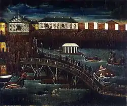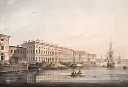 As a result of the Great Northern War of 1700–21, the valley of Neva River became part of Russian Empire. On 16 May 1703, the city of St. Petersburg was founded in the mouth of Neva and became capital of Russia in 1712.[26] Neva became the central part of the city. It was cleaned, intersected with canals and enclosed with embankments. In 1715, construction began of the first wooden embankment between the Admiralty building and the Summer Garden. In the early 1760s works started to cover it in granite and to build bridges across Neva and its canals and tributaries, such as the Hermitage Bridge.[6]