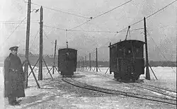 Every winter from 1895 to 1910, electric tramways were laid on the ice of the river, connecting the Senate Square, Vasilievsky island, Palace Embankment and other parts of the city. The power was supplied through the rails and a top cable supported by wooden piles frozen into the ice. The service was highly successful and ran without major accidents except for a few failures in the top electrical wires. The trams ran at the speed of 20 kilometres per hour (12 mph) and could carry 20 passengers per carriage. The carriages were converted from the used horsecars. About 900,000 passengers were transported over a regular season between 20 January and 21 March. The sparking of contacts at the top wires amused spectators in the night.[31][32][33][34]