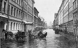 Floods in St. Petersburg are usually caused by the overflow of the delta of Neva and by surging water in the eastern part of Neva Bay. They are registered when the water rises above 160 centimetres (63 in) with respect to a gauge at the Mining Institute. More than 300 floods occurred after the city was founded in 1703.[16][17][18] Three of them were catastrophic: on 7 November 1824, when water rose to 421 centimetres (166 in); on 23 September 1924 when it reached 369 centimetres (145 in), and 10 September 1777 when it rose to 321 centimetres (126 in).[15] However, a much larger flood of 760 centimetres (300 in) was described in 1691.[19]
