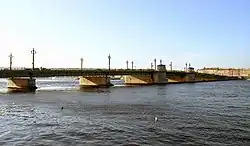 - Blagoveshchensky Bridge (formerly the Lieutenant Schmidt Bridge) – built in 1850 as a movable seven-segment iron bridge connecting Labour Square with the 7th Line of Vasilievsky Island.[6]