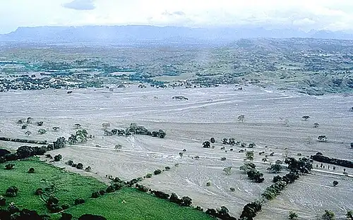 On the morning of February 19, 1845, a large earthquake resulted in a substantial mudflow.[27] This mudflow flowed down the valley of the Lagunillas River for approximately 70 km (43 mi),[11] spilling out of the river channel and killing much of the local population.[27] After reaching an alluvial fan, the mudflow split into two branches. The larger portion of it joined the Lagunillas River and flowed into the nearby Magdalena River, while the smaller portion was diverted by hills in front of Lagunillas Canyon, turned 90 degrees to the north until it reached the Sabandija River, and then flowed east with the Sabandija River, until it rejoined the other branch of the mudflow at the junction of the Sabandija and the Magdalena. It is estimated that 1000 people were killed in the mudflows.[27]