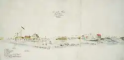 A pen-and-ink view of New Amsterdam,[27][28] drawn on-the-spot and discovered in the map collection of the Austrian National Library in Vienna in 1991, provides a unique view of New Amsterdam as it appeared from Capske (small Cape) Rock in 1648. It was associated with Adriaen van der Donck's Remonstrance of New Netherland, and may have inspired later views as by Claes Jansz. Visscher. Capske Rock was situated in the water close to Manhattan between Manhattan and Noten Eylant, and signified the start of the East River roadstead.