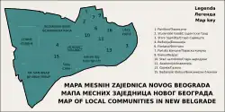 Just like other municipalities of Serbia, New Belgrade is further divided into local communities (Serbian: mesna zajednica). Apart from Bežanija and Staro Sajmište, no other neighbourhoods have historical or traditional names, as Novi Beograd did not exist as such. However, in the five decades of its existence, some of its parts gradually became known as distinct neighborhoods of their own.
