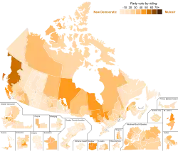 In the 2019 federal election, the NDP won only 24 seats in its worst result since 2004, shedding 15 seats.[78] Alexandre Boulerice, who was elected to his third term in Rosemont—La Petite-Patrie, was the only NDP candidate to win a seat in Quebec,[79] while the party lost all three of its Saskatchewan ridings (Desnethé—Missinippi—Churchill River, Regina—Lewvan, and Saskatoon West) to the Conservatives.[80] The party remained shut out of Toronto[81] and lost two of its MPs (Cheryl Hardcastle in Windsor—Tecumseh and Tracey Ramsey in Essex) in the rest of Ontario,[82] while making small or no gains in the popular vote in Manitoba, Newfoundland and Labrador, Alberta and Nunavut. In British Columbia, the NDP lost three seats (Kootenay—Columbia, Port Moody—Coquitlam, and, after having lost it at a by-election, Nanaimo—Ladysmith); however, they retained most of their support in the province.[83]
