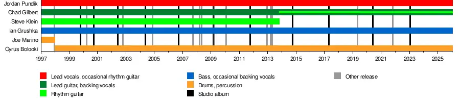 New Found Glory (formerly A New Found Glory)[1] is an American punk rock band formed in Coral Springs, Florida, in 1997. The band currently consists of Jordan Pundik (lead vocals), Ian Grushka (bass), Chad Gilbert (guitar, backing vocals), and Cyrus Bolooki (drums).[2][3] Longtime rhythm guitarist and lyricist Steve Klein left the band in late 2013.[4][5][6] During their lengthy recording career, the band have released twelve studio albums, one live album, two EPs, and four cover albums.