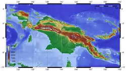 A spine of east–west mountains, the New Guinea Highlands, dominates the geography of New Guinea, stretching over 1,600 km (1,000 mi) across the island, with many mountains over 4,000 m (13,100 ft). The western half of the island contains the highest mountains in Oceania, with its highest point, Puncak Jaya, reaching an elevation of 4,884 m (16,023 ft). The tree line is around 4,000 m (13,100 ft) elevation, and the tallest peaks contain equatorial glaciers—which have been retreating since at least 1936.[13][14][15] Various other smaller mountain ranges occur both north and west of the central ranges. Except in high elevations, most areas possess a warm humid climate throughout the year, with some seasonal variation associated with the northeast monsoon season.