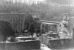 The town and the industrial activity had been in decline before then, but after the mills closed migration away from the village accelerated, and the buildings began to deteriorate.[4] The top two floors of Mill Number 1 were removed in 1945 but the building has since been restored and is now the New Lanark Mill Hotel. In 1963 the New Lanark Association (NLA) was formed as a housing association and commenced the restoration of Caithness Row and Nursery Buildings. In 1970 the mills, other industrial buildings and the houses used by Dale and Owen were sold to Metal Extractions Limited, a scrap metal company. In 1974 the NLCT (now the NLT) was founded to prevent demolition of the village. A compulsory purchase order was used in 1983 to recover the mills and other buildings from Metal Extractions after a repairs notice had been served in 1979. This was because of the state of repair of the buildings despite their listing as historic buildings that required their legal preservation in 1971.[8] They are now controlled by the NLT, either directly through the Trust or through wholly owned companies (New Lanark Trading Ltd, New Lanark Hotel Ltd and New Lanark Homes).[9] By 2005 most of the buildings had been restored and the village has become a major tourist attraction.