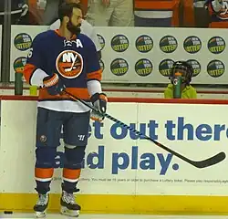 On September 10, 2013, Tavares was introduced as the 14th captain in New York Islanders history, replacing former Islander Mark Streit of the Philadelphia Flyers, who served as team captain since 2011.[132] After posting a 4–4–3 record in their first 11 games, the Islanders made a trade, sending fan favorite and three-time 30-goal scorer Matt Moulson, their 2014 first-round draft pick and their 2015 second-round draft pick to the Buffalo Sabres in exchange for Thomas Vanek, a highly regarded and dynamic goal scorer.[133][134] Despite chemistry with linemates Tavares and Kyle Okposo, however, his desire to test free agency and the team's impending move to Barclays Center[135] led to Vanek being dealt to the Montreal Canadiens at the trade deadline for Sebastian Collberg and a 2014 second-round pick.[136][137] After a season of player swapping and goaltending issues, they failed to qualify for the playoffs, finishing with a record of 34–37–11.[138]