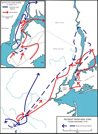 General Howe, after consolidating British positions around New York harbor, detached 6,000 men under the command of two of his more difficult subordinates, Henry Clinton, and Hugh, Earl Percy to take Newport, Rhode Island and its strategic port east across Long Island Sound (which they did without opposition on December 8),[23] while he sent General Lord Cornwallis to chase Washington's army through New Jersey. The Americans withdrew across the Delaware River into Pennsylvania in early December.[24]
