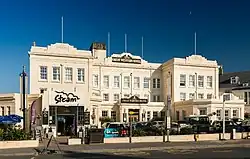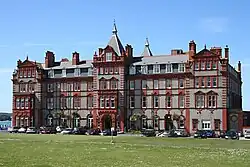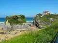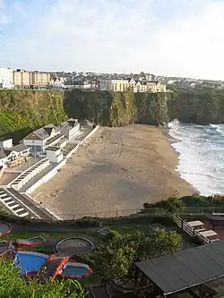 Several major hotels were built around the end of the 19th century, the first being the Great Western Hotel which opened in 1879 on Station Road, now Cliff Road. The original hotel was enlarged and altered in the 1930s.[25] Other early first-class hotels included the Victoria (1899), the Atlantic (1892) and the Headland (1900) near Fistral,[26] Many smaller hotels were also being opened. Some were created around the turn of the century by converting large houses, many of which had been built originally by wealthy visitors as holiday homes, particularly along Narrowcliff.
