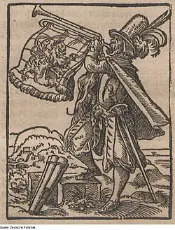 Woodcut by Tommaso Garzoni depicting a town crier with a trumpet