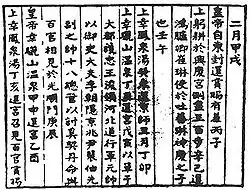 The world's first written news may have originated in eighth century BCE China, where reports gathered by officials were eventually compiled as the Spring and Autumn Annals. The annals, whose compilation is attributed to Confucius, were available to a sizeable reading public and dealt with common news themes—though they straddle the line between news and history.[56] The Han dynasty is credited with developing one of the most effective imperial surveillance and communications networks in the ancient world.[57] Government-produced news sheets, called tipao, circulated among court officials during the late Han dynasty (second and third centuries AD). Between 713 and 734, the Kaiyuan Za Bao ("Bulletin of the Court") of the Chinese Tang dynasty published government news; it was handwritten on silk and read by government officials.[58] The court created a Bureau of Official Reports (Jin Zhouyuan) to centralize news distribution for the court.[59] Newsletters called ch'ao pao continued to be produced and gained wider public circulation in the following centuries.[60] In 1582 there was the first reference to privately published newssheets in Beijing, during the late Ming dynasty.[61][62]
