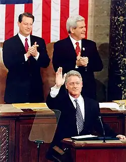 As House Speaker, Gingrich oversaw passage by the House of welfare reform in 1996 and a capital gains tax cut in 1997. Gingrich played a key role in several government shutdowns, and impeached President Bill Clinton on a party-line vote in the House. A disappointing showing by Republicans in the 1998 congressional elections, a reprimand from the House for Gingrich's ethics violation, and pressure from Republican colleagues resulted in Gingrich's announcing that he would not run for the speakership in the upcoming congress, resigning from the House on January 3, 1999, the same day his term as speaker ended.[4] Academics have credited Gingrich with playing a key role in hastening partisanship and political polarization in the United States.[5][6][7][8][9]