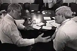 By May 1997, Republican congressional leaders reached a compromise with Democrats and President Clinton on the federal budget. The agreement called for a federal spending plan designed to reduce the federal deficit and achieve a balanced budget by 2002. The plan included a total of $152 billion in bipartisan tax cuts over five years.[88] Other major parts of the spending plan called for $115 billion to be saved through a restructuring of Medicare, $24 billion set aside to extend health insurance to children of the working poor, tax credits for college tuition, and a $2 billion welfare-to-work jobs initiative.[89][90]