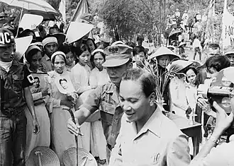 Nguyễn Văn Thiệu (Vietnamese: [ŋʷǐənˀ vān tʰîəwˀ] ⓘ; 5 April 1923 – 29 September 2001) was a South Vietnamese military officer and politician who was the president of South Vietnam from 1967 to 1975.[2][3] He was a general in the Republic of Vietnam Armed Forces (RVNAF), became head of a military junta in 1965, and then president after winning a rigged election in 1967. He headed the government of South Vietnam until he resigned and left the nation and relocated to Taipei a few days before the fall of Saigon and the ultimate North Vietnamese victory.