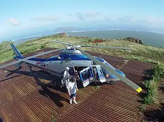 Some residents have radio and television sets, although limited reception effectively limits the latter to watching pre-recorded media.[40] Niʻihau is subject to regular droughts that occasionally force the population to evacuate to Kauaʻi temporarily, until rainfall replenishes their water supply. Residents commonly also commute to Kauaʻi for work, medical care, or school, and many of them call both islands home. To avoid a long boat ride, the island's owners maintain an Agusta A109 helicopter for emergencies and for transporting Navy contractors and residents to and from Kauaʻi. Helicopter tours and safaris help offset the costs of this service.[41]