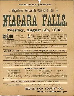 In 1843, Frederick Douglass joined the American Anti-Slavery Society's "One Hundred Conventions" tour throughout New York and the midwest. Sometime on this tour, Douglass visited Niagara Falls and wrote a brief account of the experience: "When I came into its awful presence, the power of description failed me, an irresistible power closed my lips."[56] Being on the Canadian border, Niagara Falls was on one of the routes of the Underground Railroad. The falls were also a popular tourist attraction for Southern slaveowners, who would bring their enslaved workers on the trip. "Many a time the trusted body-servant, or slave-girl, would leave master or mistress in the discharge of some errand, and never come back."[57] This sometimes led to conflict. Early town father Peter Porter assisted slavecatchers in finding runaway slaves, even leading, in the case of runaway Solomon Moseby, to a riot in Niagara-on-the-Lake, Canada.[58] Much of this history is memorialized in the Niagara Falls Underground Railroad Heritage Center. After the American Civil War, the New York Central Railroad publicized Niagara Falls as a focus of pleasure and honeymoon visits. After World War II, the auto industry, along with local tourism boards, began to promote Niagara honeymoons.[59]