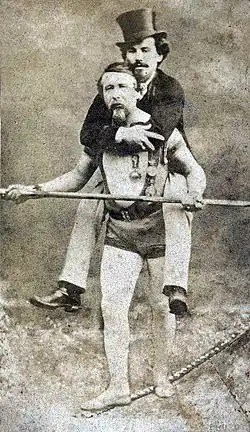 Tightrope walkers drew huge crowds to witness their exploits. Their wires ran across the gorge, near the current Rainbow Bridge, not over the waterfall. Jean François "Blondin" Gravelet was the first to cross Niagara Gorge on June 30, 1859, and did so again eight times that year. His most difficult crossing occurred on August 14, when he carried his manager, Harry Colcord, on his back.[121] His final crossing, on September 8, 1860, was witnessed by the Prince of Wales.[122][123] Author Ginger Strand argues that these performances may have had symbolic meanings at the time relating to slavery and abolition.[124]