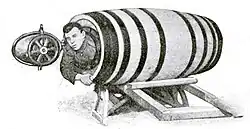 On October 24, 1901, 63-year-old Michigan school teacher Annie Edson Taylor became the first person to go over the falls in a barrel as a publicity stunt; she survived, bleeding, but otherwise unharmed. Soon after exiting the barrel, she said, "No one ought ever do that again."[92] Days before Taylor's attempt, her domestic cat was sent over the falls in her barrel to test its strength. The cat survived the plunge unharmed and later posed with Taylor in photographs.[93] Since Taylor's historic ride, over a dozen people have intentionally gone over the falls in or on a device, despite her advice. Some have survived unharmed, but others have drowned or been severely injured. Survivors face charges and stiff fines, as it is now illegal, on both sides of the border, to attempt to go over the falls. Charles Stephens, a 58-year-old barber from Bristol, England, went over the falls in a wooden barrel in July 1920 and was the first person to die in an endeavor of this type.[94] Bobby Leach went over Horseshoe Falls in a crude steel barrel in 1911 and needed rescuing by William "Red" Hill Sr.[95] Hill again came to the rescue of Leach following his failed attempt to swim the Niagara Gorge in 1920. In 1928, "Smiling Jean" Lussier tried an entirely different concept, going over the falls in a large rubber ball; he was successful and survived the ordeal.[96]