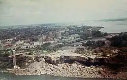 Erosion control efforts have always been of importance. Underwater weirs redirect the most damaging currents, and the top of the falls has been strengthened. In June 1969, a temporary rock and earth dam was constructed, completely diverting the Niagara River from American Falls for several months.[34] During this time, two bodies were removed from under the falls, including a man who had been seen jumping over the falls, and the body of a woman, which was discovered once the falls dried.[35][36] While Horseshoe Falls absorbed the extra flow, the U.S. Army Corps of Engineers studied the riverbed and mechanically bolted and strengthened any faults they found; faults that would, if left untreated, have hastened the retreat of American Falls. A plan to remove the huge mound of talus deposited in 1954 was abandoned owing to cost,[37] and in November 1969, the temporary dam was dynamited, restoring flow to American Falls.[38] Even after these undertakings, Luna Island, the small piece of land between the American Falls and Bridal Veil Falls, remained off limits to the public for years owing to fears that it was unstable and could collapse into the gorge.