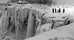 The only recorded freeze-up of the river and falls was caused by an ice jam on March 29, 1848. No water (or at best a trickle) fell for as much as 40 hours. Waterwheels stopped, and mills and factories shut down for having no power.[68] In 1912, American Falls was completely frozen, but the other two falls kept flowing. Although the falls commonly ice up most winters, the river and the falls do not freeze completely. The years 1885, 1902, 1906, 1911, 1932, 1936, 2014, 2017 and 2019 are noted for partial freezing of the falls.[69][70][71] A so-called ice bridge was common in certain years at the base of the falls and was used by people who wanted to cross the river before bridges had been built. During some winters, the ice sheet was as thick as 12 to 30 metres (40 to 100 ft), but that thickness has not occurred since 1954. The ice bridge of 1841 was said to be at least 30 metres (100 ft) thick.[72] On February 4, 1912, the ice bridge, which had formed on January 15 began breaking up while people were still on it. Many escaped, but three died during the event, later named the Ice Bridge Tragedy.[73]