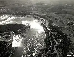 On August 6, 1918, an iron scow became stuck on the rocks above the falls.[63] The two men on the scow were rescued, but the vessel remained trapped on rocks in the river, and is still visible there in a deteriorated state, although its position shifted by 50 meters (160 ft) during a storm on October 31, 2019.[64] Daredevil William "Red" Hill Sr. was particularly praised for his role in the rescue.[65]