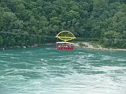 The observation deck of the nearby Skylon Tower offers the highest view of the falls, and in the opposite direction gives views as far as Toronto. Along with the Tower Hotel (built as the Seagrams Tower, later renamed the Heritage Tower, the Royal Inn Tower, the Royal Center Tower, the Panasonic Tower, the Minolta Tower, and most recently the Konica Minolta Tower[141] before receiving its current name in 2010), it is one of two towers in Canada with a view of the falls.[142] The Whirlpool Aero Car, built in 1916 from a design by Spanish engineer Leonardo Torres Quevedo, is a cable car that takes passengers over the Niagara Whirlpool on the Canadian side. The Journey Behind the Falls consists of an observation platform and series of tunnels near the bottom of the Horseshoe Falls on the Canadian side.[143] There are two casinos on the Canadian side of Niagara Falls, the Niagara Fallsview Casino Resort and Casino Niagara.[144]